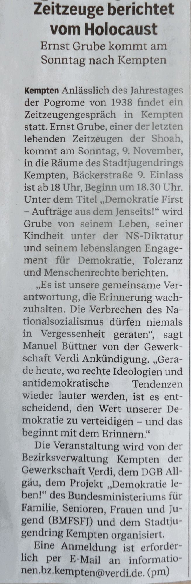 Anlässlich des Jahrestages der Pogromnacht kam Ernst Grube, einer der letzten Zeitzeugen des Holocaust nach Kempten, um über seine Erfahrungen zu berichten. Die Veranstaltung wurde vom DGB Allgäu, der Gewerkschaft Ver.di, dem Stadtjugendring, dem Projekt "Demokratie leben" und dem Bundesministerium für Familie, Senioren, Frauen Jugend organisiert.