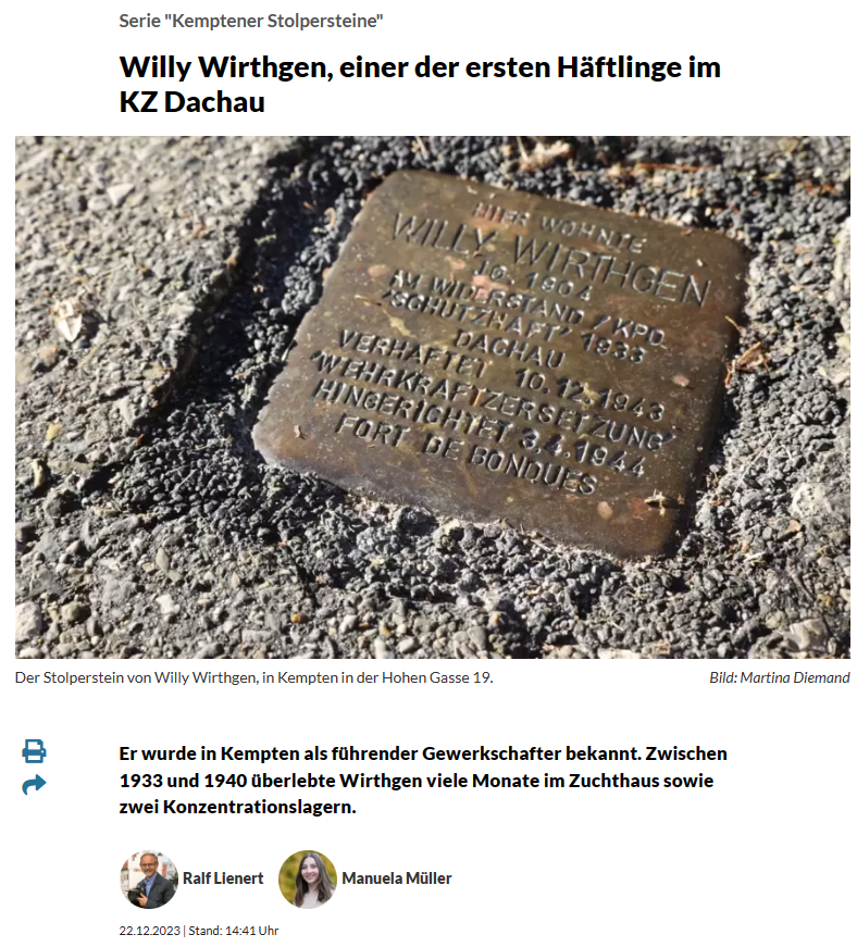 Die Nachforschungen zu den Opfern des Faschismus bringen immer wieder neue Erkenntnisse zu Tage. Damit wird es auch immer wieder erforderlich, Stolpersteine zu erneuern und mit neuen Daten zu versehen. Am 03.05.2023 wurden die Stolpersteine für Sigmund Ullmann (Immenstädter Str. 20) und Willy Wirthgen (Hohe Gasse 19) neu verlegt.