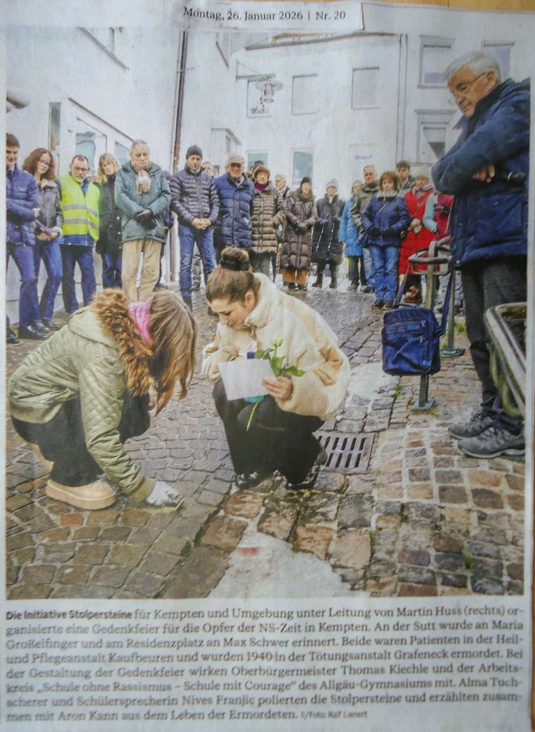 Vor 81 Jahren wurde das Vernichtungslager Ausschwitz am 26. Januar von der sowjetischen Armee befreit. Die Initiative STOLPERSTEINE für Kempten und Umgebung lud zu diesem Anlass zu einem Stadtrundgang ein. Stellvertretend für die 12 Millionen zivilen Opfer wurde in diesem Jahr auf die 100.000 ermordeten Patienten aus Heil- und Pflegeanstalten aufmerksam gemacht. Daher wurden die, für die Opfer von Euthanasie- Programmen, Maria Grosselfinger und Max Schwer, verlegten Stolpersteine besucht, gereinigt und aus dem Leben der Opfer berichtet. Oberbürgermeister Thomas Kiechle und Schülerinnen und Schüler des Allgäu Gymnsiums beteiligten sich aktiv mit Beiträgen an der Gestaltung der Gedenkfeier.