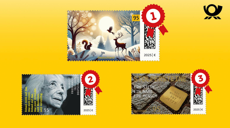 Bereits seit Dezember 2025 gibt die Post eine Briefmarke mit einem Stolperstein heraus, der die Aufschrift „NIE WIEDER IST JETZT“ trägt. Damit wird die Initative STOLPERSTEINE als weltweit größtes dezentrales Mahnmal geehrt, mit dem inzwischen an über 120.000 Menschen erinnert wird, die Opfer des Faschismus wurden. Doch damit nicht genug wurde sie trotz kurzem Erscheinungsdatum zum drittschönsten Motiv 2025 gewählt.